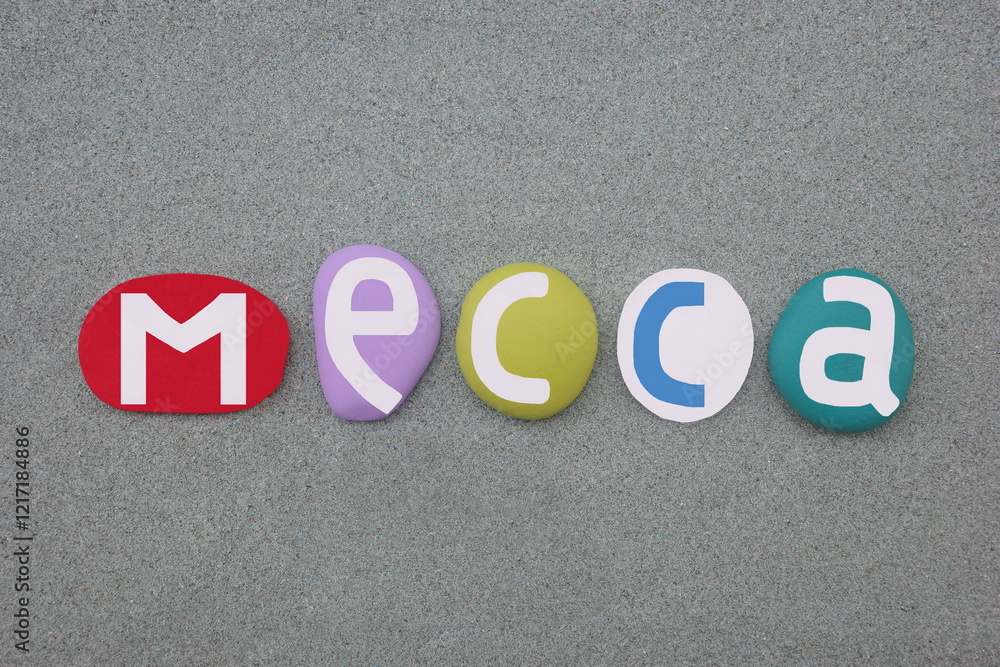 Mecca, the capital of Mecca Province in the Hejaz region of western Saudi Arabia, souvenir composed with multi colored hand painted stone letters over green sand
