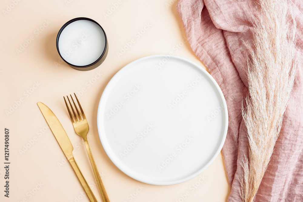 Flat lay of an elegant table setting with a white plate, golden cutlery, a pink linen napkin, and dried pampas grass on a soft beige background. Top view, mockup