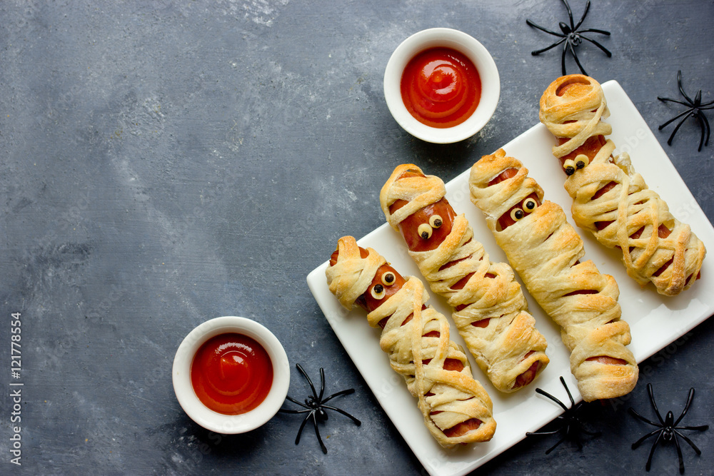 Halloween background. Funny sausage mummies with ketchup for halloween