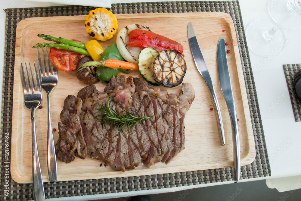 beef steak on a wooden table.