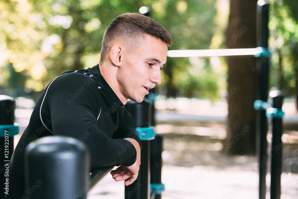Outdoor portrait of healthy handsome active man with fit muscular body, sports and fitness concept