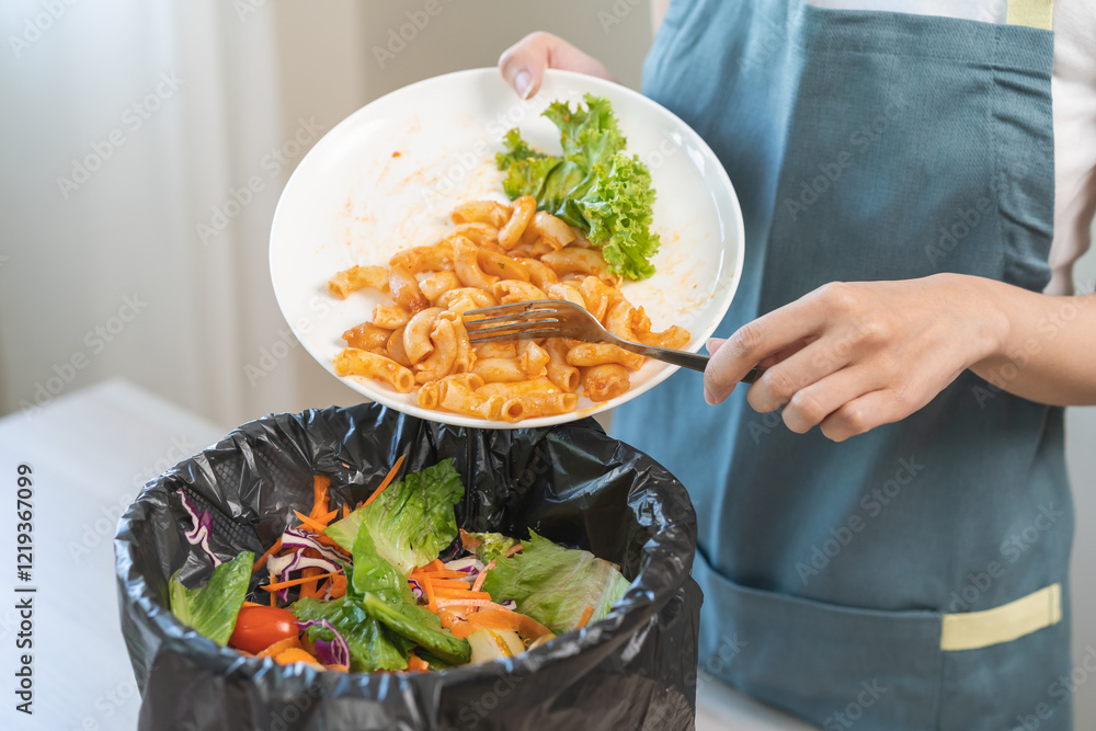 Compost from leftover food asian young housekeeper woman, girl hand holding macaroni plate use fork throw away food scraps, rotten vegetable into trash. Environmentally responsible, food waste concept