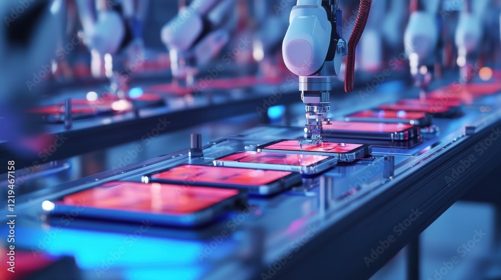 Robotic arms assembling smartphones on a production line in a technology factory during daylight hours