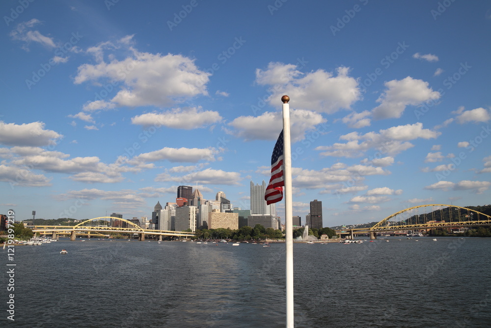 Flag over the confluence of the Allegheny River and Olentangy River in downtown Pittsburgh, Pennsylvania