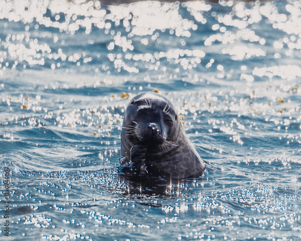 Harbor seal swimming in shimmering waters at Ytri Tunga beach, Snaefellsnes, West Iceland
