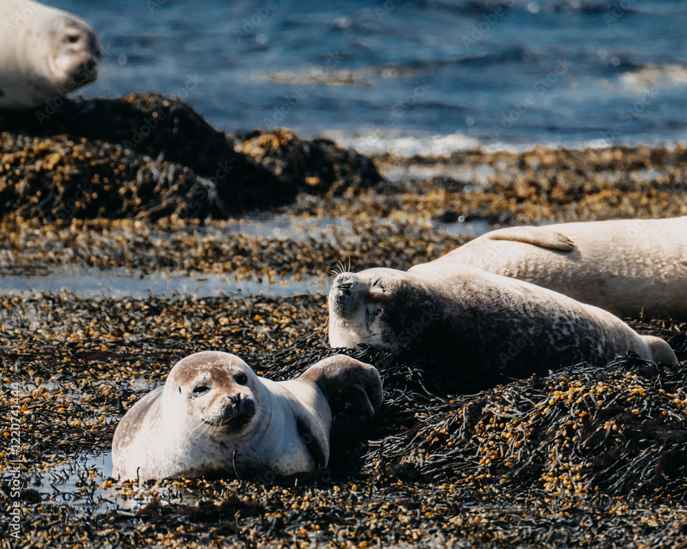 Harbor seals resting on seaweed-covered rocks at Ytri Tunga Beach, Snæfellsnes Peninsula, Iceland.