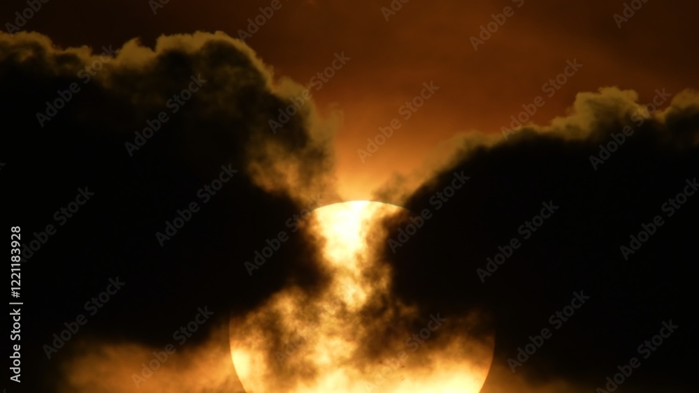 Big pale sun disk during dramatic stormy sunset in cloudy sky. Witchcraft horror and terror background. Fantasy magic and enigmatic mood. White sun and black dark smoky sky with a big clouds