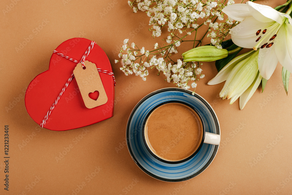 Red heart-shaped box with flowers and a cup of coffee on a beige background, symbolizing love and relaxation. Valentines day concept. Top view, flat lay
