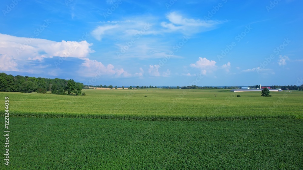 Aerial view of agricultural farms and crops fields. Agricultural landscapes from above depicting vibrancy of farms in Canadian soil. Planted corn and soy. Planting rows of crops during sun set.