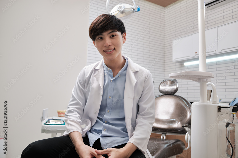 Portrait of one young smart Asian male dentist in uniform, Thai professional dental occupation worker, teeth healthcare, hygiene work in dental clinic hospital, happy smile, and looking at camera.