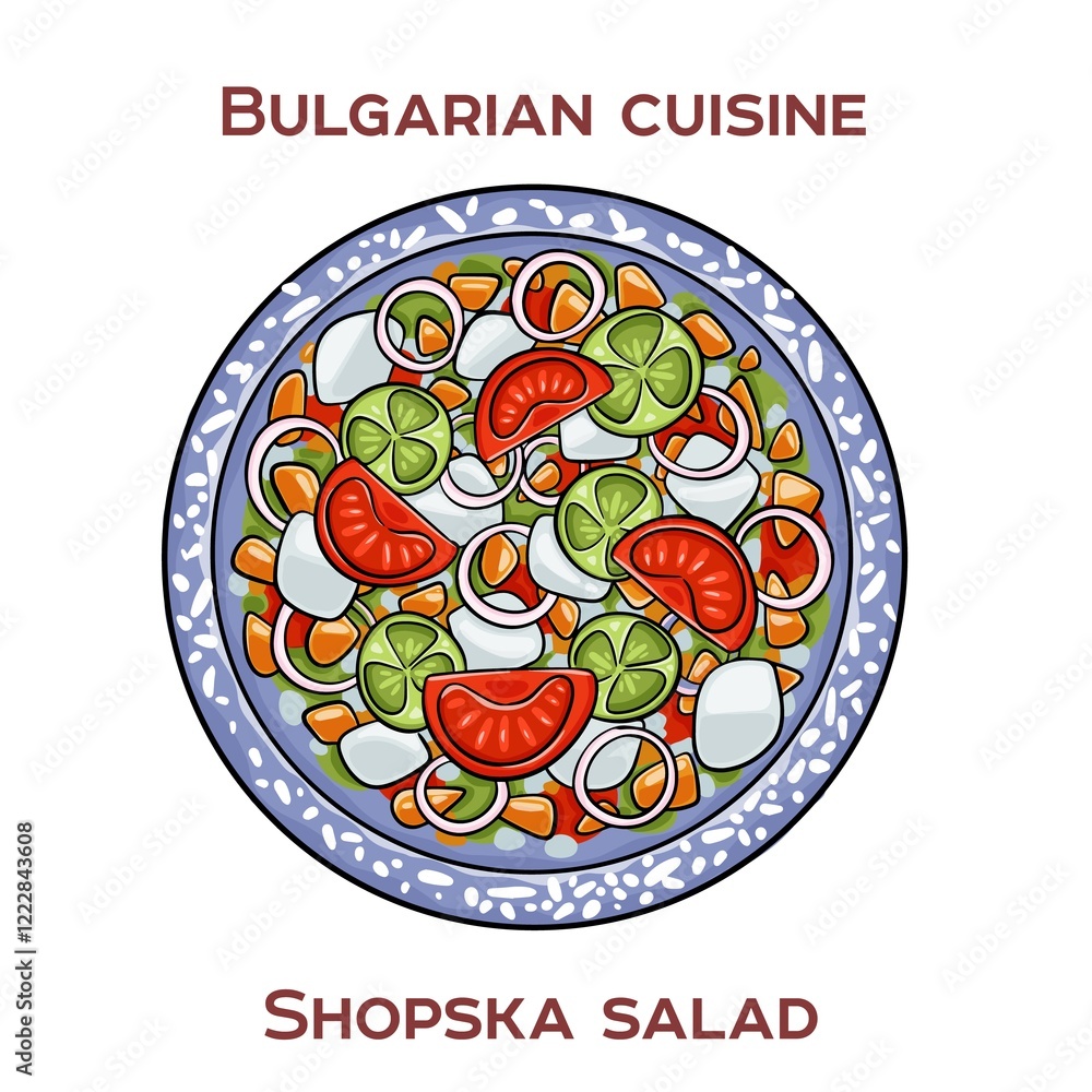Shopska salad is a vibrant Bulgarian dish featuring diced tomatoes, cucumbers, and bell peppers topped with crumbled white sirene cheese, dressed with sunflower oil and vinegar.