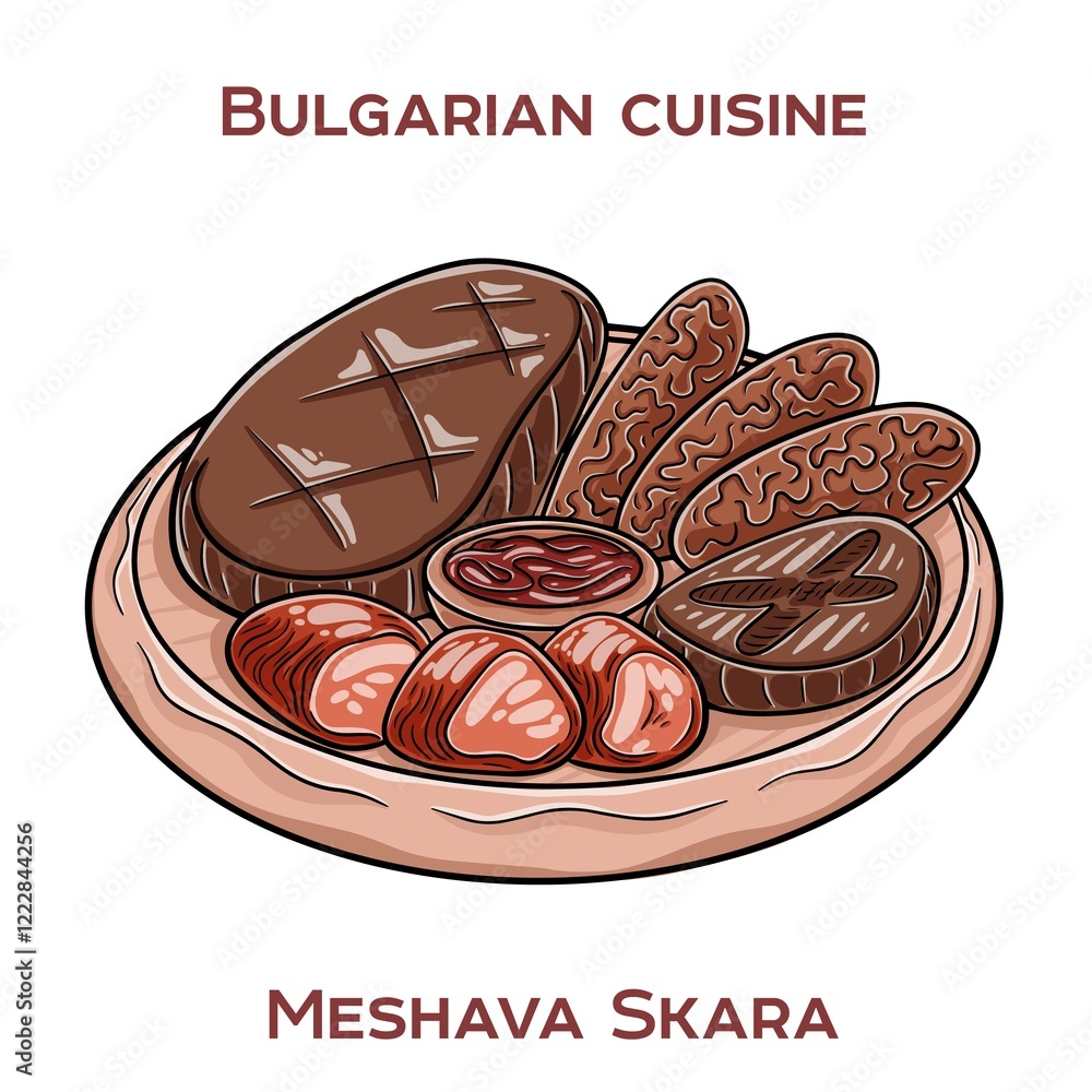 Bulgarian Mixed Grill (Meshana Skara): A hearty platter featuring an assortment of grilled meats including kebapche, kyufte, pork steaks, and sausages, served with fresh vegetables ands.