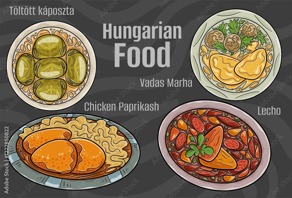 A hand-drawn vector illustration featuring a collection of famous Hungarian dishes.