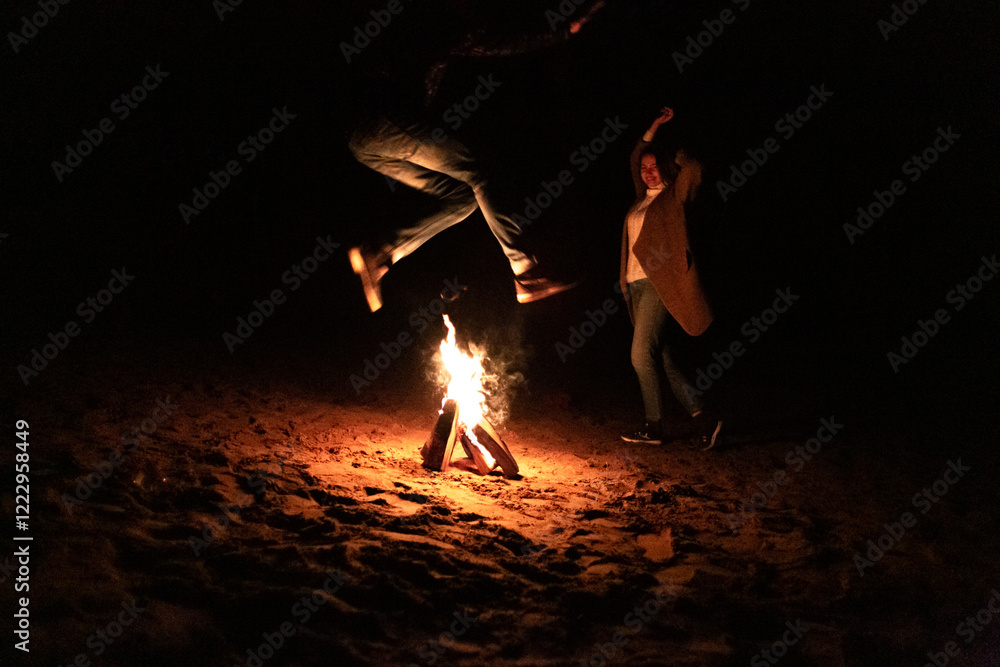 A couple in love at night jumps over a fire, flames of fire, firewood is burning, fire, night, love story, Valentine's day.