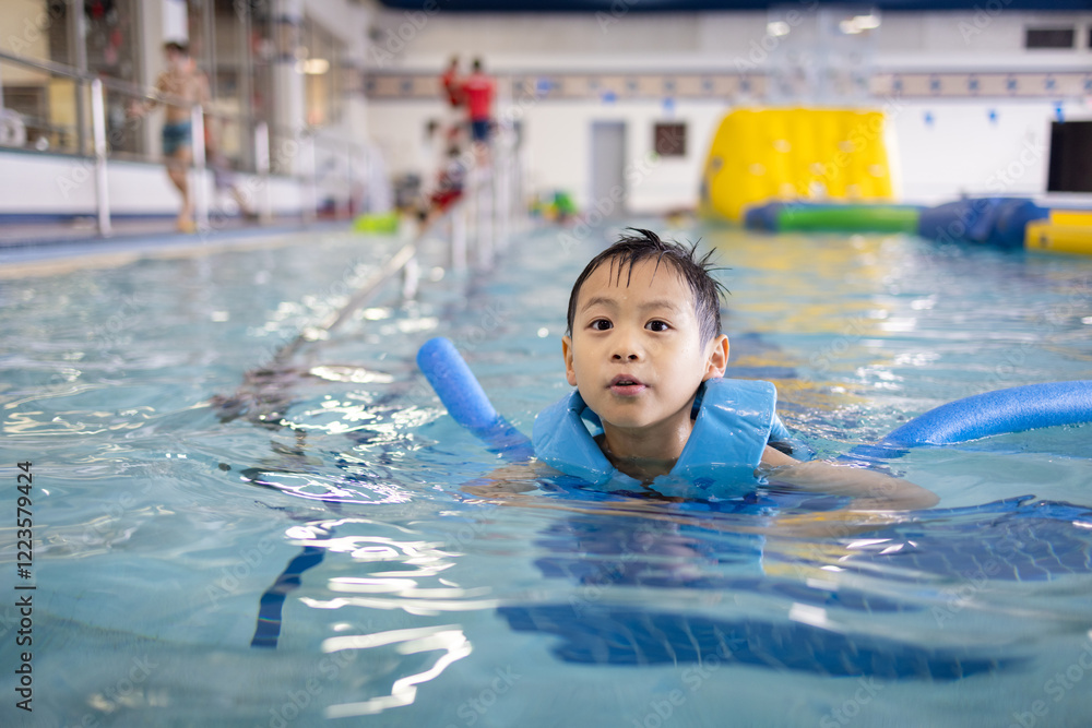 Young boy is swimming in a pool wearing a life jacket