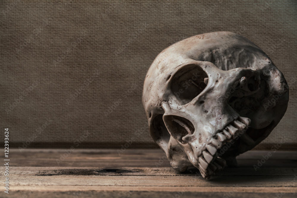 Still life with human skull on wood table