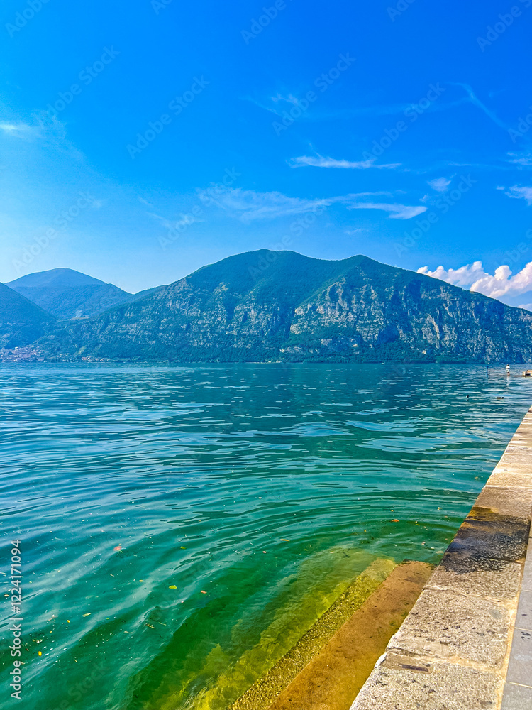 View of Iseo Lake Surrounded by Majestic Mountains and Clear Blue Skies, Italy