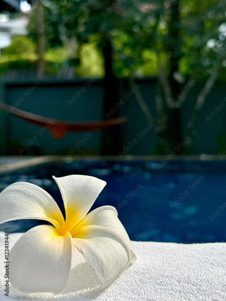 Tropical Flower by the Pool. A pristine white tropical flower resting on a soft towel, with a blurred background of a swimming pool and lush greenery.