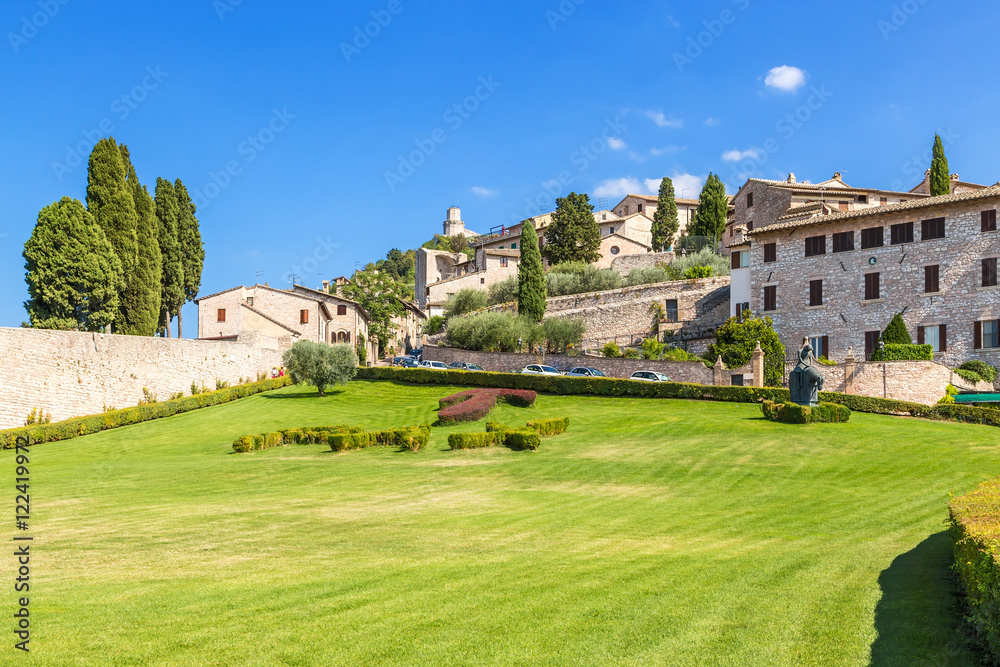 Assisi, Italy. The lawn in front of St. Francis Cathedral: Tau cross and motto of the Franciscan «Pax et Bonum»