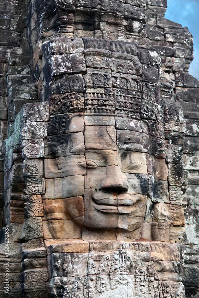 Giant stone face at Prasat Bayon temple in Angkor Thom, Cambodia