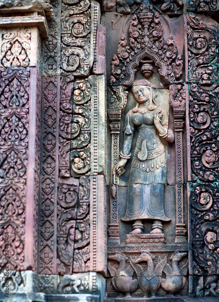 Ancient bas-relief in Banteay Srey Temple, Cambodia