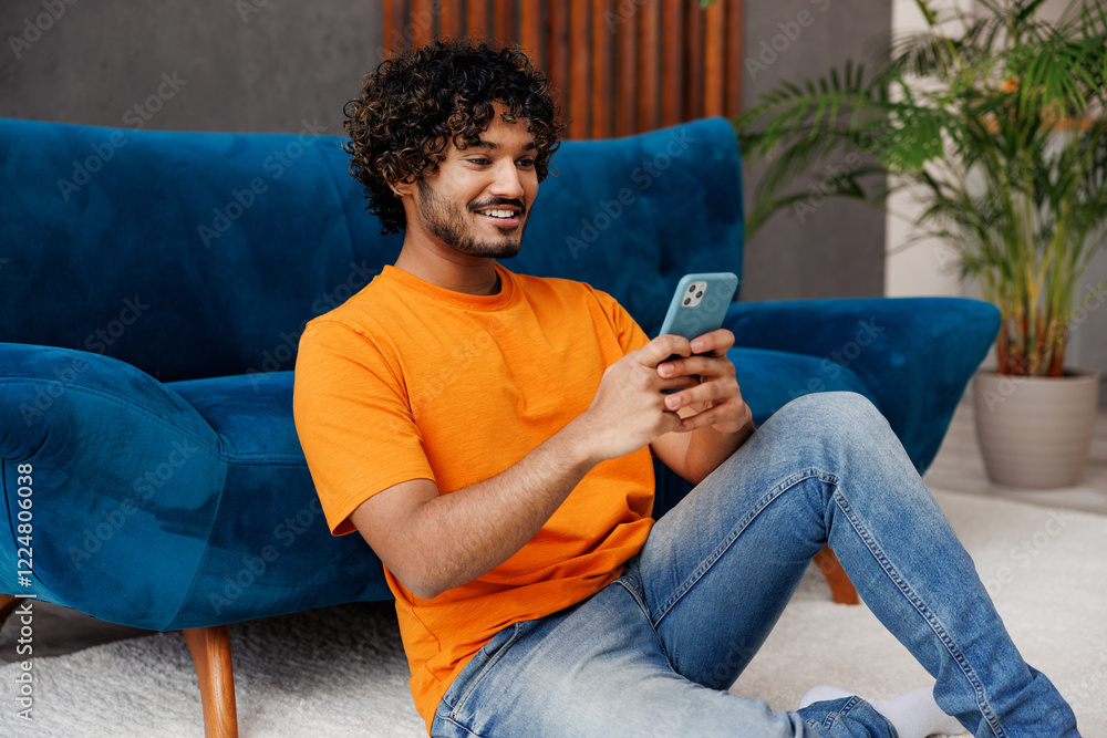 Side view young Indian man wear orange casual clothes sit near blue sofa couch hold use mobile cell phone stay at home hotel flat rest relax spend free spare time in living room indoor Lounge concept