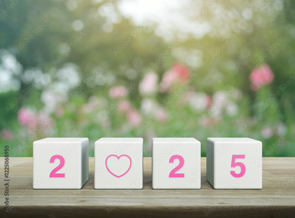 Love icon with 2025 letter on white block cubes on wooden table over blur pink flower and tree in garden, Happy new year and Valentines day 2025 concept