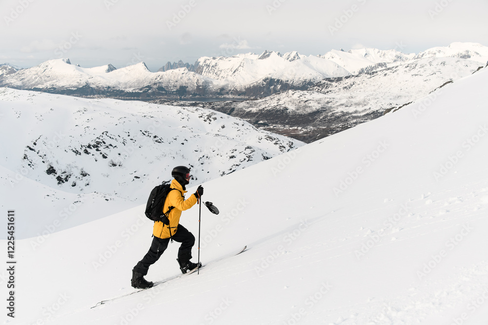 One-armed confident skier skis up the slope against a background of a beautiful mountains
