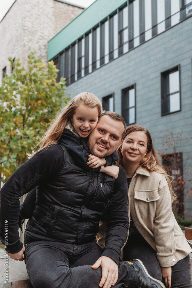 Happy family father mother and cute little daughter walking