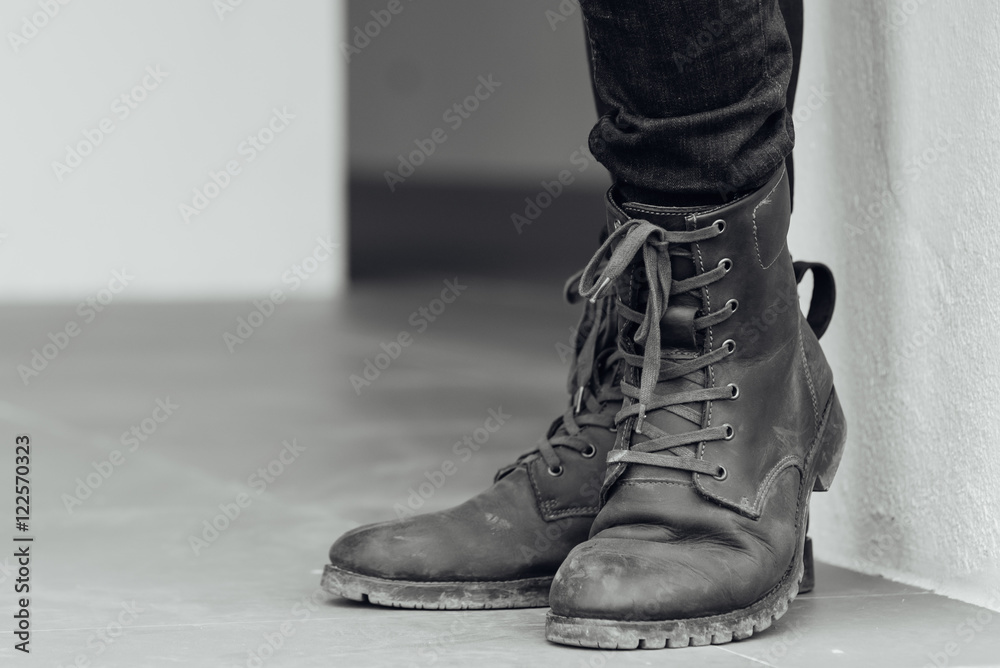 Close up view on man's legs in black jeans and brown leather boots. black and white