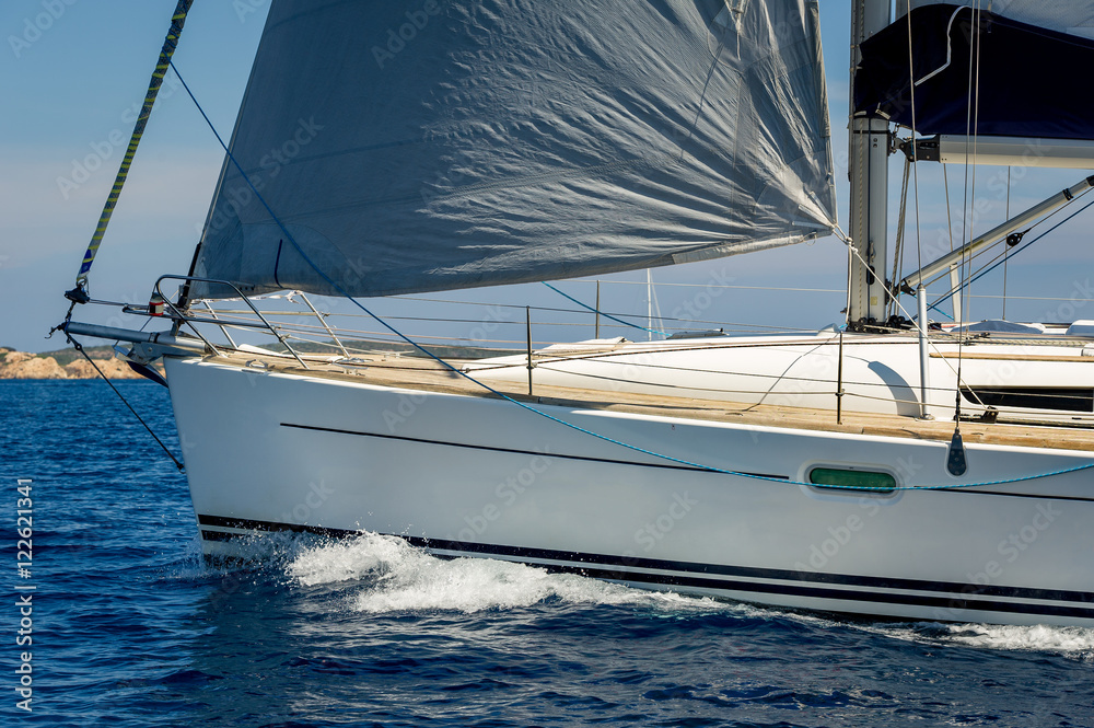 Sailboat bow with hoisted genoa is sailing in the Mediterranean