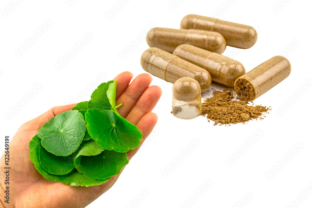 Green Asiatic Pennywort (Centella asiatica , Hydrocotyle umbellata L or Water pennywort ) in hand of man and herbal capsule and powder on white background,selective focus.
