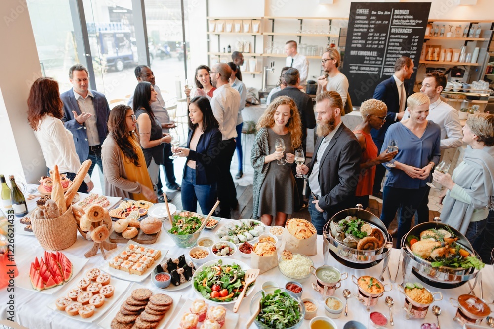 A diverse group of people at a buffet-style gathering, enjoying food and drinks. The event features a variety of dishes and lively conversation in a bright setting. Diverse people mingle at buffet.
