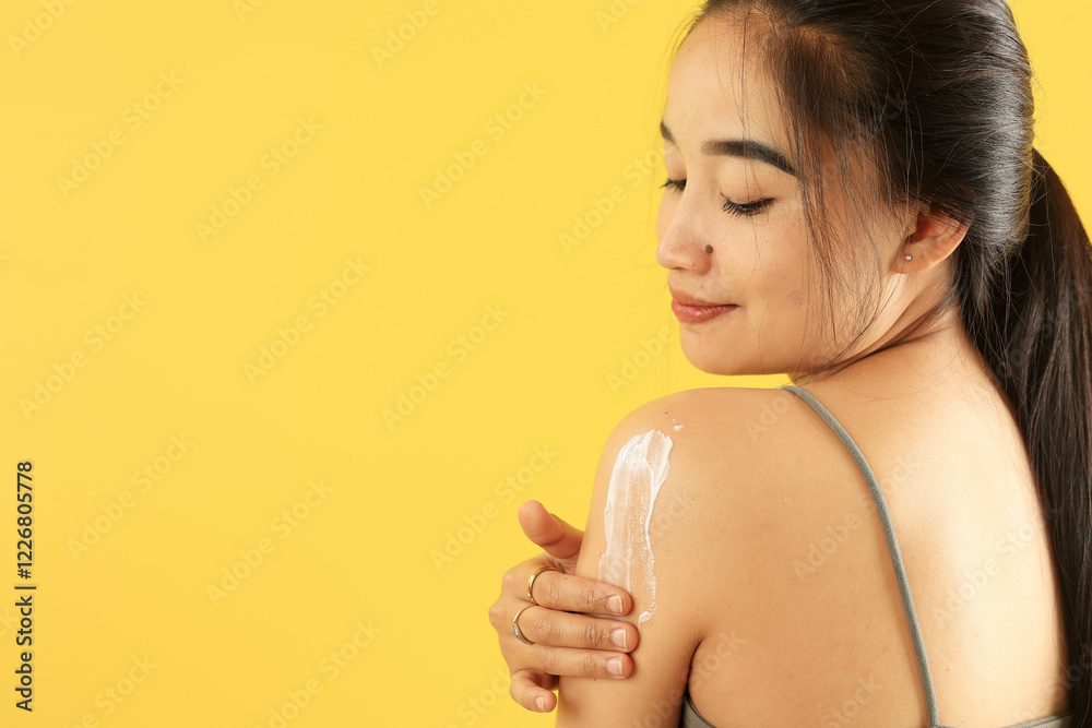 Asian Young Woman Applying Sunscreen Lotion on Her Upper Arm