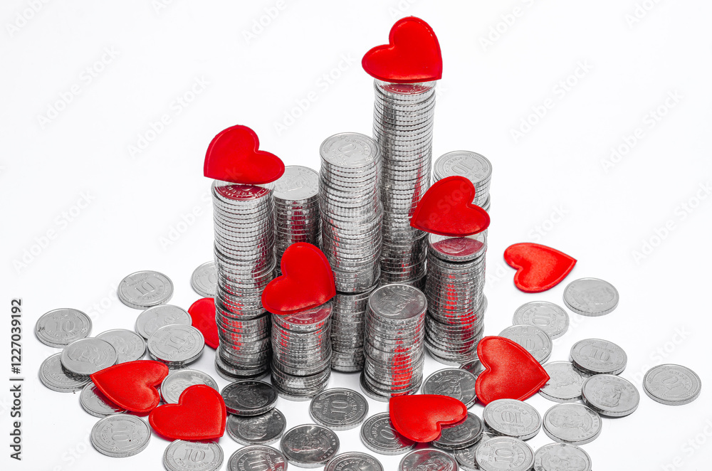 Towers of coins, red hearts. Happy Valentine's Day, banner, greeting card, money envelope. Close up.