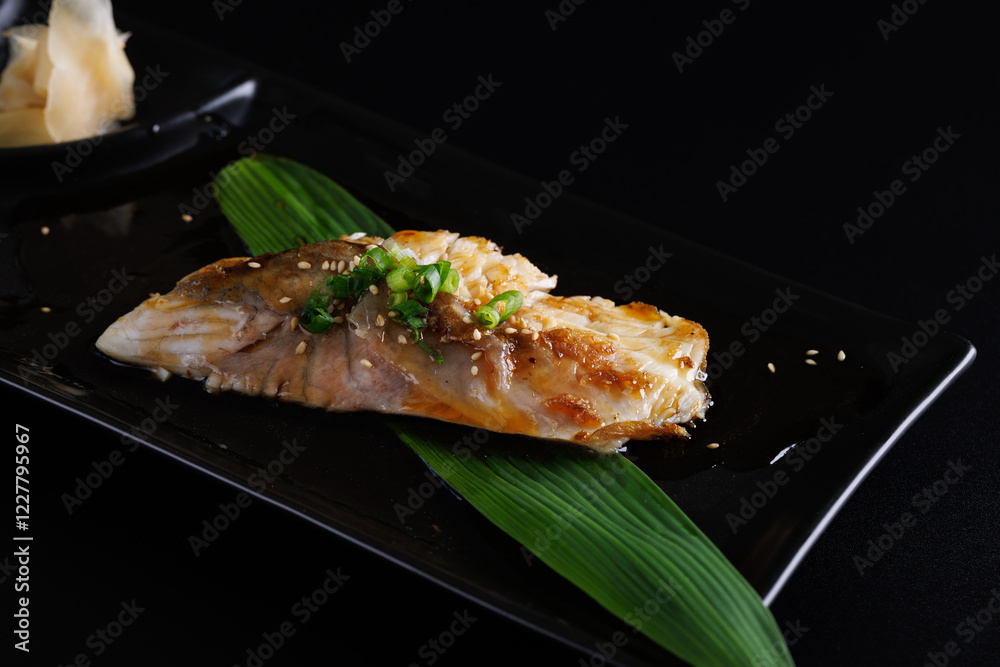 Grilled Seabass with teriyaki sauce Japan fish Japanese food isolate in black background