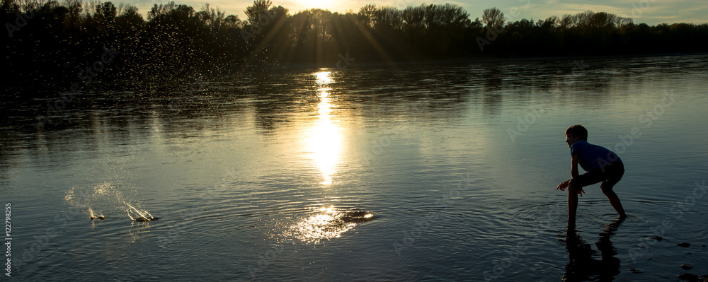 Bub wirft Steine in Fluss bei Sonnenuntergang