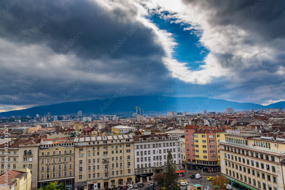 Buildings in downtown city center of Sofia, Bulgaria - wide shot from a roof top - periodical architecture with dramatic autumn sky and magical sunlight above