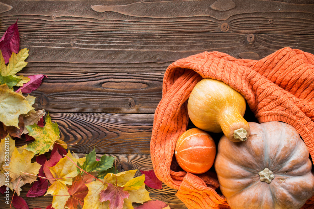 halloween pumpkins shrouded in cozy knitting orange sweater, fallen leaves on wooden table, top view