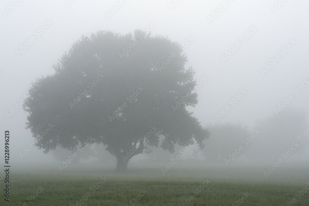 Oak (Quercus robur), Fog, Alpen-Menzelen, North Rhine-Westphalia, Germany, Europe