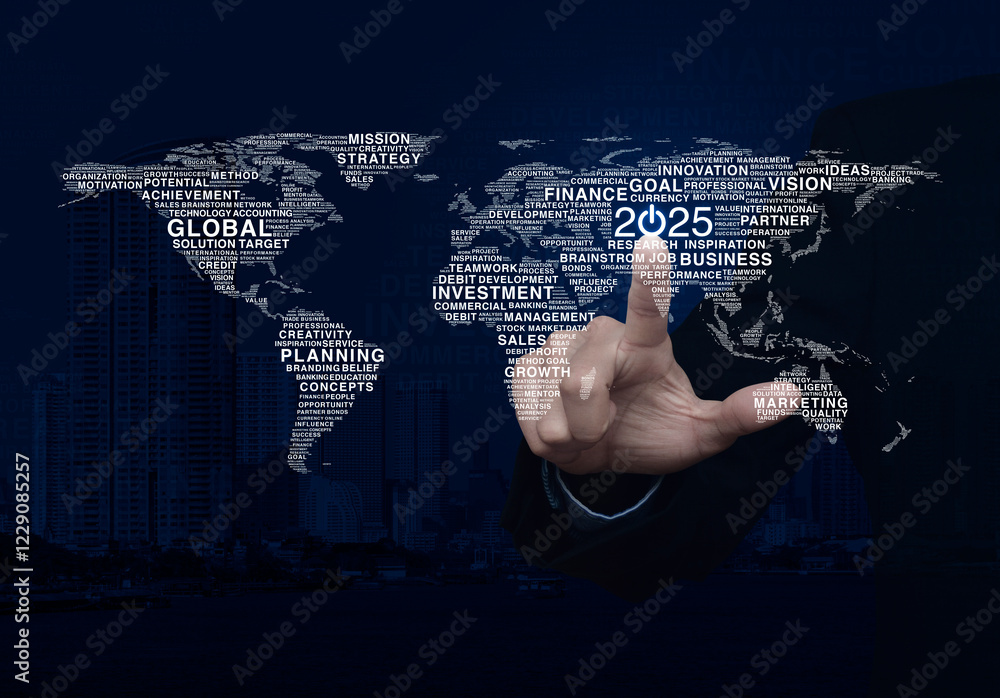 Businessman pressing 2025 start up icon with global business words world map over city tower, Happy new year 2025 global business start up concept, Elements of this image furnished by NASA