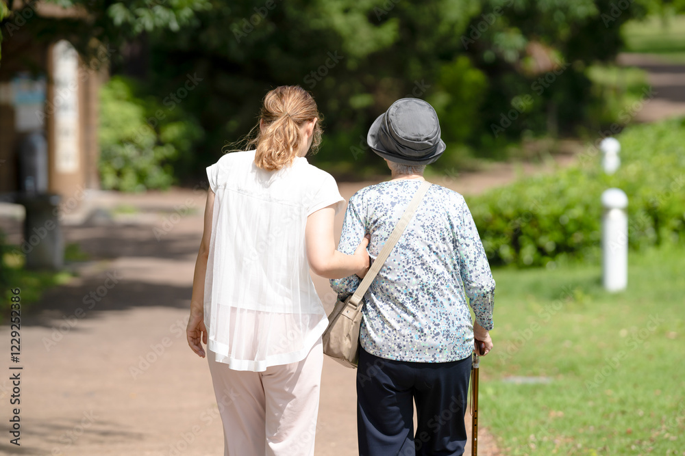 A park with good atmosphere with canal in Toyama Prefecture. Old woman in her 90s and Japanese woman in her thirties are walking around the park.