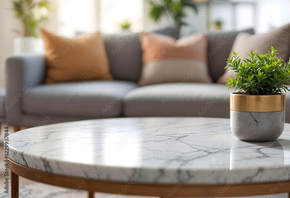 Modern living room interior with a green plant in a pot standing on a white black marble table