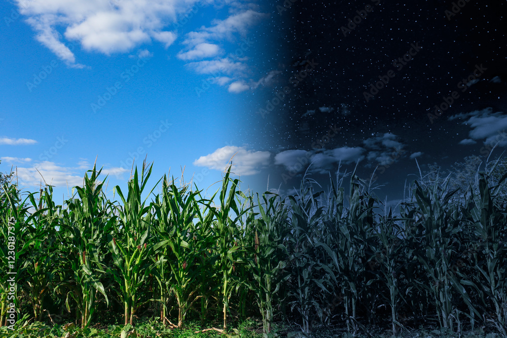 Field of corn by day and under starry night sky, low angle view. Time of day change, collage