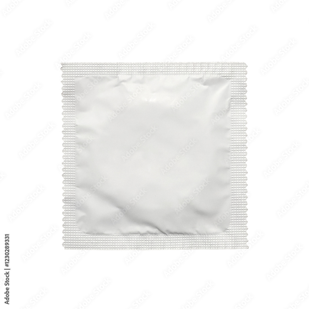 A white sealed foil condom wrapper isolated on a clean transparent background, ideal for health, safe sex, and lifestyle-related stock photography. PNG