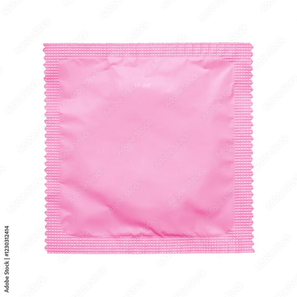 A vibrant matte pink sealed foil condom wrapper isolated on a clean white background, ideal for health, safe sex, and lifestyle-related stock photography