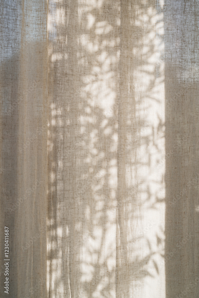 Floral sunlight shadows on a neutral beige linen curtains, aesthetic minimalist natural background with copy space