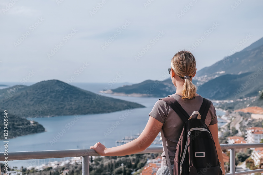 ourney, young woman embarks solo journey, middle breathtaking mountain panorama. Embracing self-care digital nomad lifestyle, freedom, adventure and personal growth
