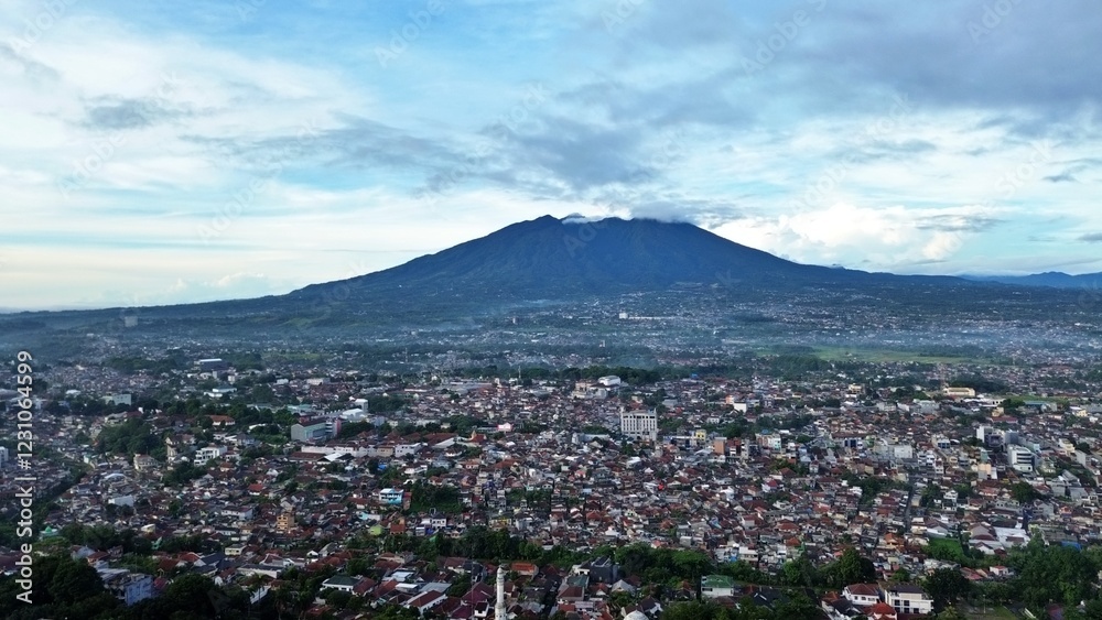 View of Puncak Bogor city with mountains in the background at dawn. Houses fill the foreground with misty peaks in the background. Dramatic sunrise over the sprawling city.