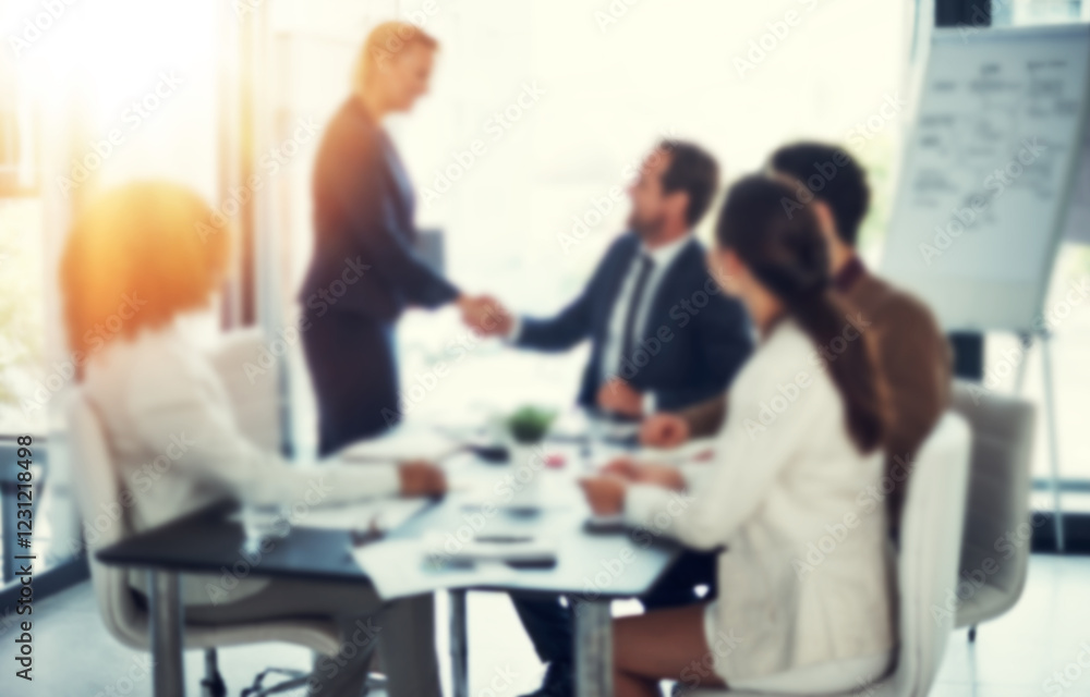 Handshake, success and blur with business people in meeting for contract merger, acquisition and thank you. Teamwork, loan agreement and banking firm with employees in office with lens flare